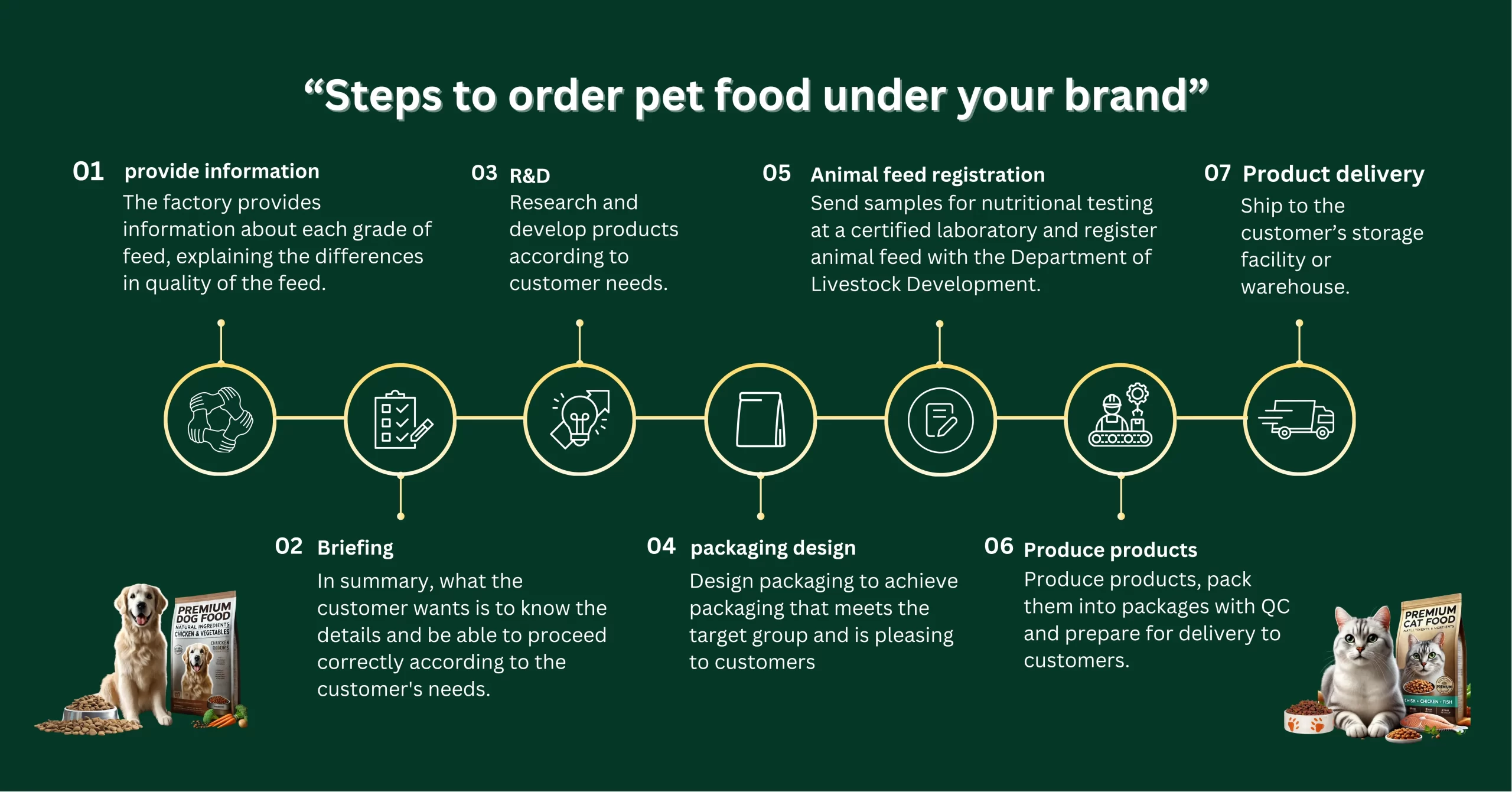 In addition, we handle registration with the Department of Livestock Development (DLD), covering all legal requirements, production standards, and certifications. Therefore, your products comply with Thai regulations and are ready for the domestic market.